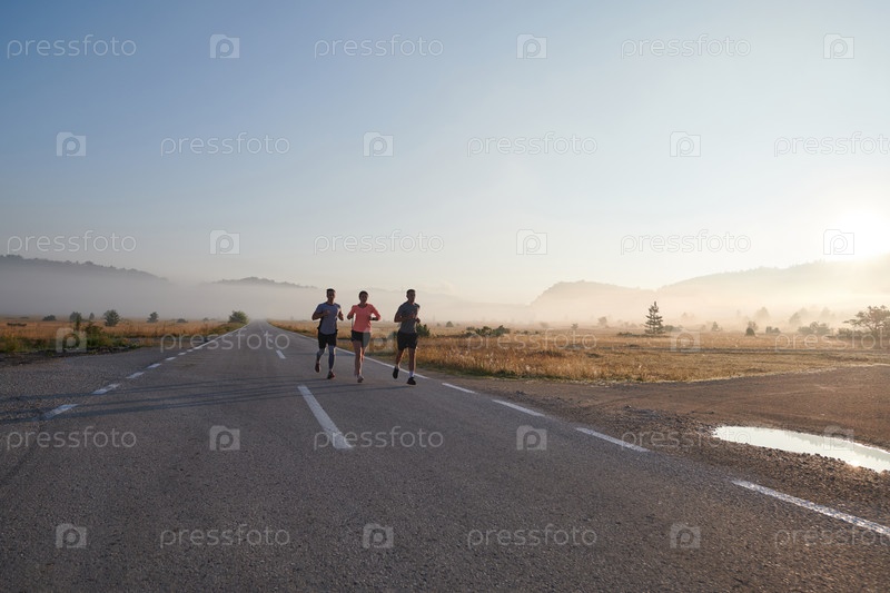 Группа друзей, спортсменов и любителей бега бегом ранним утром пробегает сквозь туманный рассвет, зарядившись энергией восходящего солнца и окруженная спокойной красотой природы