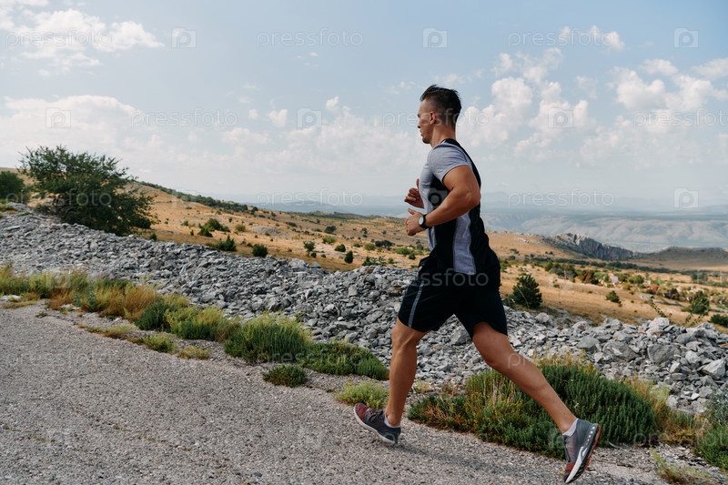 Решительный спортсмен бежит по пересеченной горной местности на рассвете