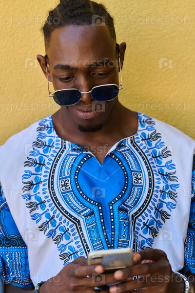 Афроамериканский подросток в традиционной суданской одежде пользуется смартфоном