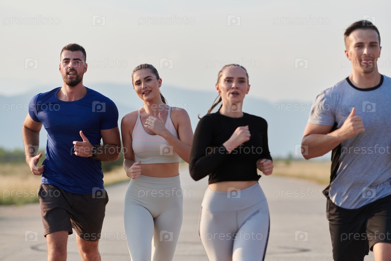 Группа друзей ведет здоровый образ жизни, бегая на свежем воздухе в солнечный день, занимаясь фитнесом и наслаждаясь бодрящим эффектом физических упражнений и природы
