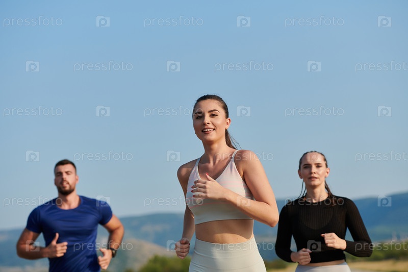 Группа друзей ведет здоровый образ жизни, бегая на свежем воздухе в солнечный день, занимаясь фитнесом и наслаждаясь бодрящим эффектом физических упражнений и природы