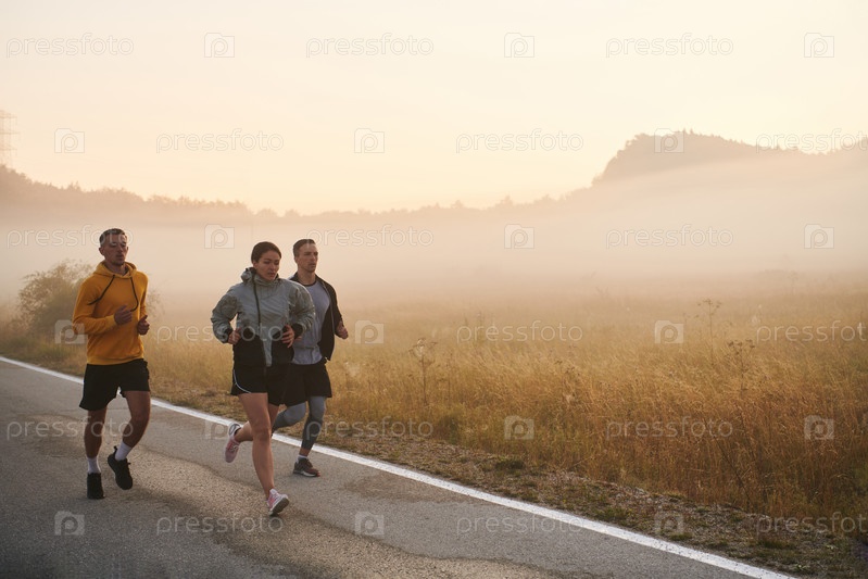 Группа друзей, спортсменов и любителей бега бегом ранним утром пробегает сквозь туманный рассвет, зарядившись энергией восходящего солнца и окруженная спокойной красотой природы
