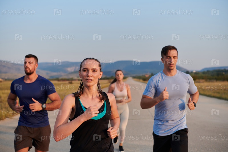 Группа друзей ведет здоровый образ жизни, бегая на свежем воздухе в солнечный день, занимаясь фитнесом и наслаждаясь бодрящим эффектом физических упражнений и природы