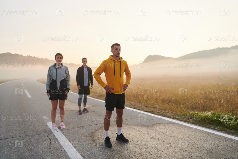 Группа друзей, спортсменов и любителей бега бегом ранним утром пробегает сквозь туманный рассвет, зарядившись энергией восходящего солнца и окруженная спокойной красотой природы