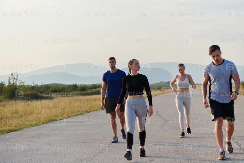 Группа друзей ведет здоровый образ жизни, бегая на свежем воздухе в солнечный день, занимаясь фитнесом и наслаждаясь бодрящим эффектом физических упражнений и природы