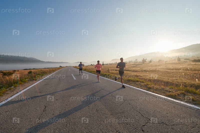 Группа друзей, спортсменов и любителей бега бегом ранним утром пробегает сквозь туманный рассвет, зарядившись энергией восходящего солнца и окруженная спокойной красотой природы