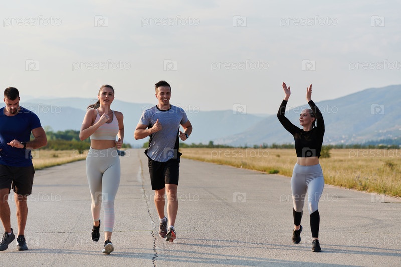 Группа друзей ведет здоровый образ жизни, бегая на свежем воздухе в солнечный день, занимаясь фитнесом и наслаждаясь бодрящим эффектом физических упражнений и природы