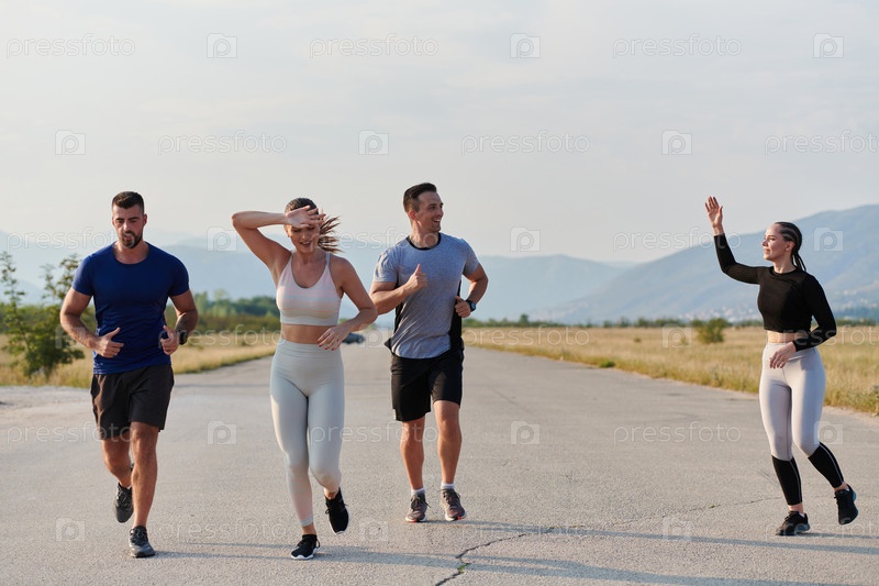 Группа друзей ведет здоровый образ жизни, бегая на свежем воздухе в солнечный день, занимаясь фитнесом и наслаждаясь бодрящим эффектом физических упражнений и природы