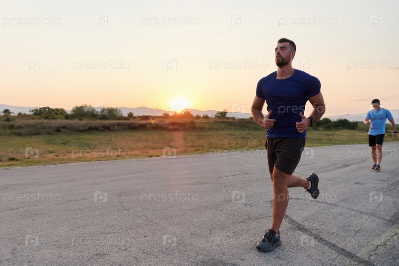 Разнообразная группа бегунов тренируется вместе на закате
