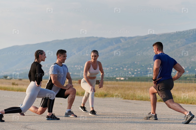 Разнообразная группа спортсменов вместе готовится к забегу