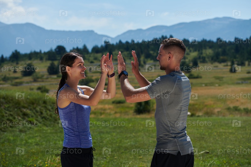 Победоносные объятия: романтические рукопожатия пары после успешного ежедневного забега