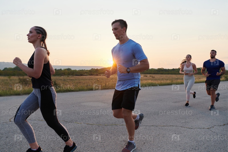 Разнообразная группа бегунов тренируется вместе на закате