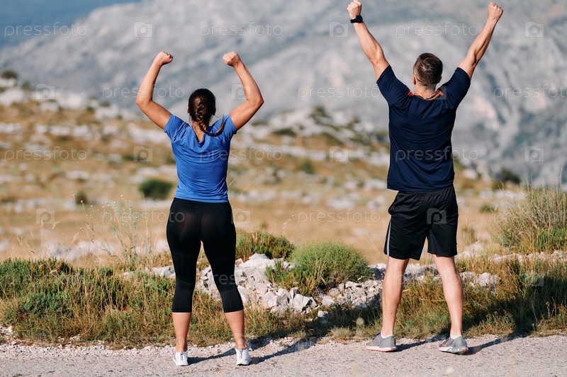 Радостная пара празднует успешное завершение утренней пробежки