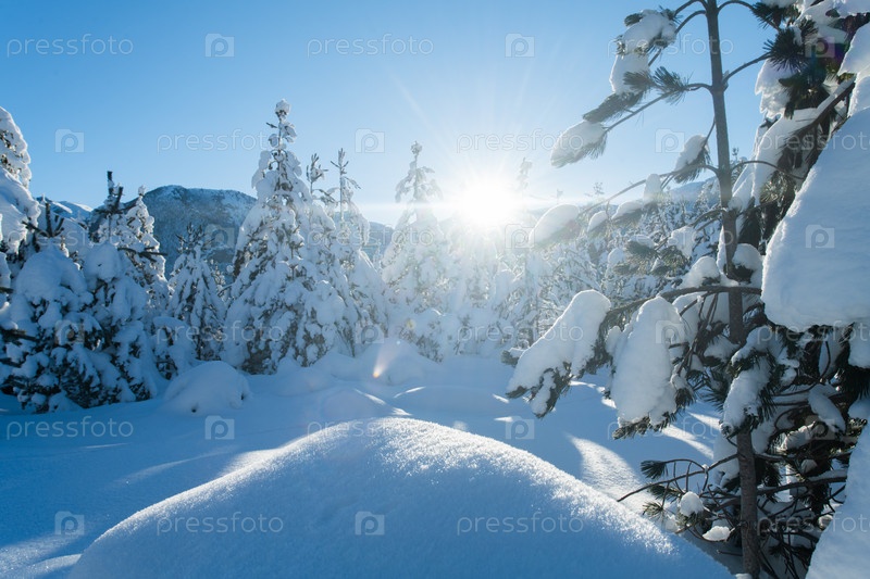 Величественный сосновый лес, залитый солнечным светом на заснеженных горах
