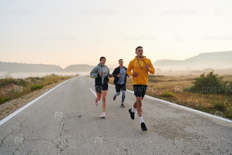 Группа друзей, спортсменов и бегунов бегут рано утром, пробегая сквозь туманный рассвет, зарядившись энергией восходящего солнца и окруженные спокойной красотой природы