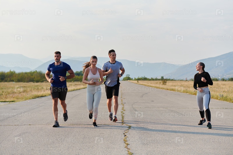 Группа друзей ведет здоровый образ жизни, бегая на свежем воздухе в солнечный день, занимаясь фитнесом и наслаждаясь бодрящим эффектом физических упражнений и природы