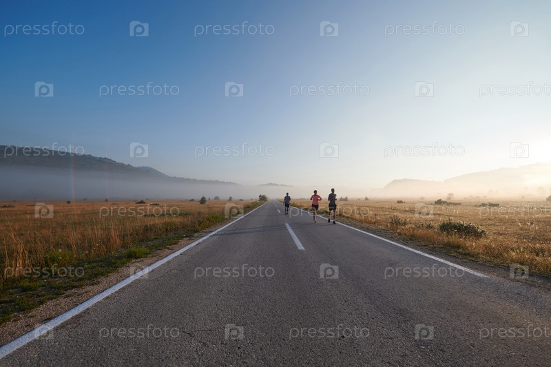 Группа друзей, спортсменов и любителей бега бегом ранним утром пробегает сквозь туманный рассвет, зарядившись энергией восходящего солнца и окруженная спокойной красотой природы