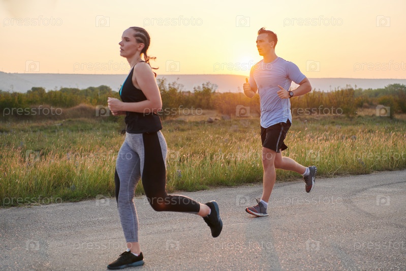 Разнообразная группа бегунов тренируется вместе на закате