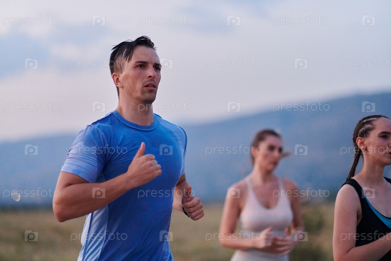Разнообразная группа бегунов тренируется вместе на закате