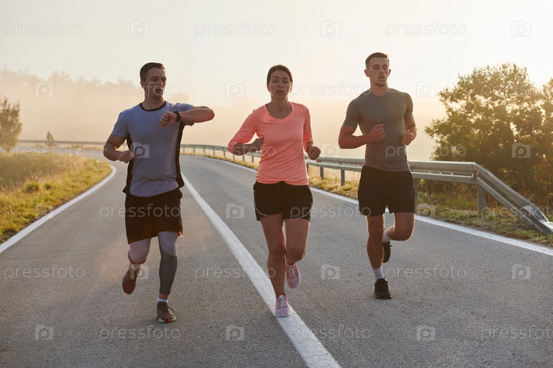 Группа друзей, спортсменов и любителей бега бегом ранним утром пробегает сквозь туманный рассвет, зарядившись энергией восходящего солнца и окруженная спокойной красотой природы
