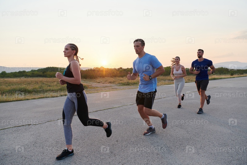Разнообразная группа бегунов тренируется вместе на закате