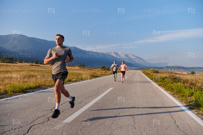 Группа друзей ведет здоровый образ жизни, бегая на свежем воздухе в солнечный день, занимаясь фитнесом и наслаждаясь бодрящим эффектом физических упражнений и природы