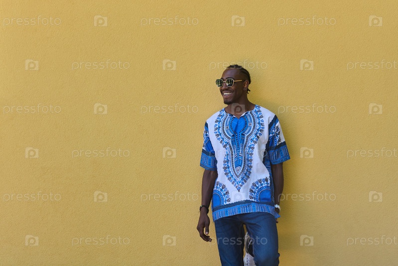 Суданские традиции встречаются с современной молодежью: афроамериканский подросток в яркой традиционной одежде на желтом фоне