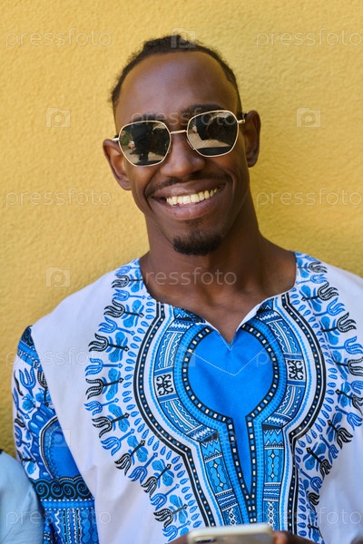 Афроамериканский подросток в традиционной суданской одежде пользуется смартфоном