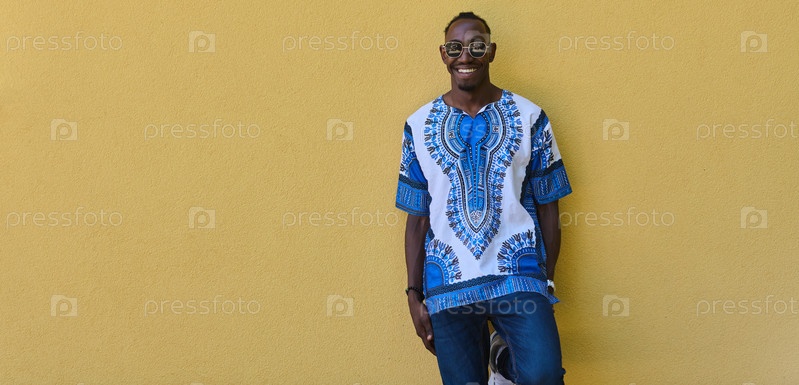 Суданские традиции встречаются с современной молодежью: афроамериканский подросток в яркой традиционной одежде на желтом фоне