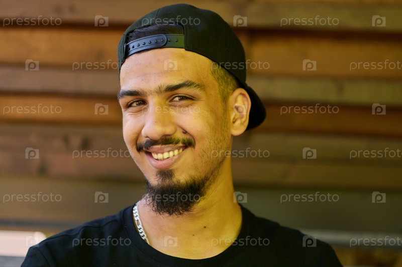 Крупный план портрета улыбающегося суданского подростка с широкой улыбкой, подбородком и кепкой
