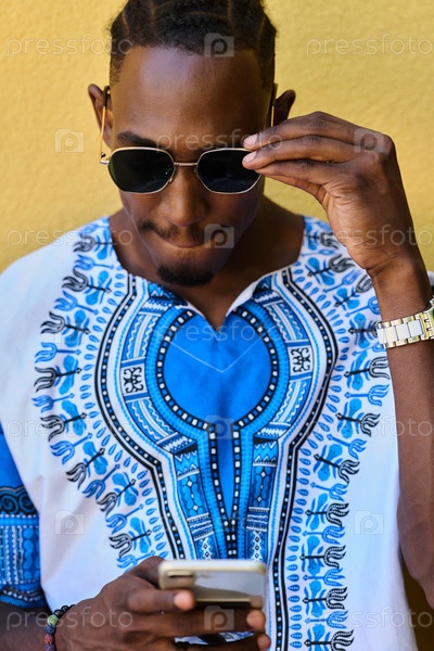 Афроамериканский подросток в традиционной суданской одежде пользуется смартфоном