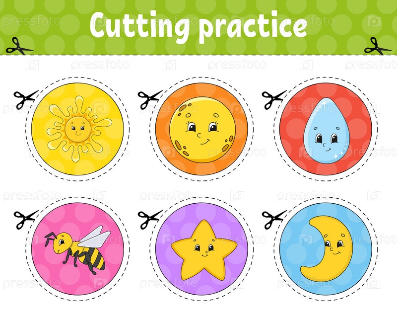 Практика резки. Лист с наклейками. Лист образовательной деятельности для детей и малышей. Игра для детей. Векторная иллюстрация