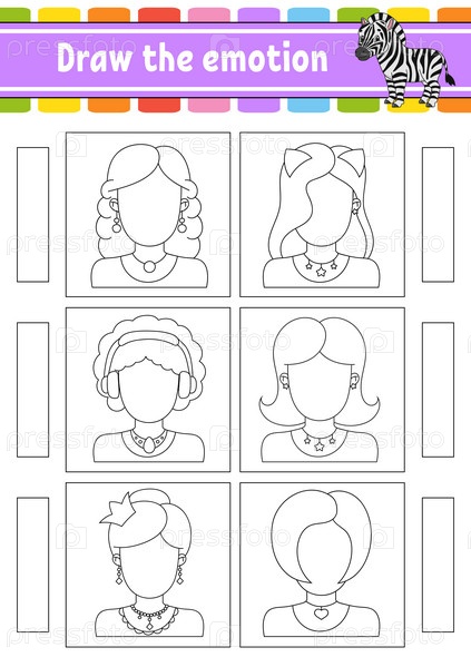 Нарисуйте эмоцию. Рабочий лист завершает лицо. Раскраска для детей. Веселый персонаж. Векторная иллюстрация. Черный контурный силуэт. Векторная иллюстрация