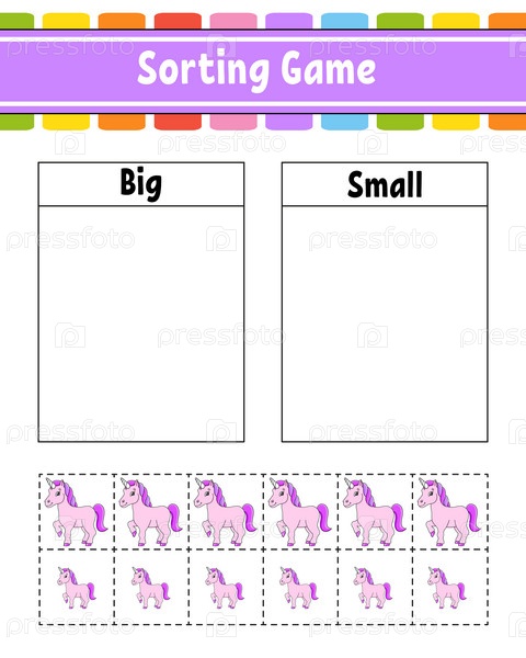 Сортировочная игра для детей. Счастливые персонажи. Большой и маленький. Рабочий лист по образованию. Векторная иллюстрация