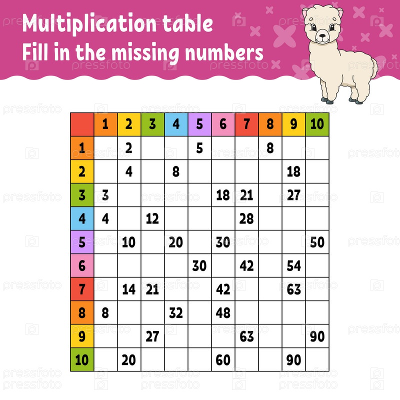 Вставьте недостающие цифры. Изучение таблицы умножения. Практика почерка. Рабочий лист по развитию образования. Цветная страница активности. Игра для детей. Векторная иллюстрация