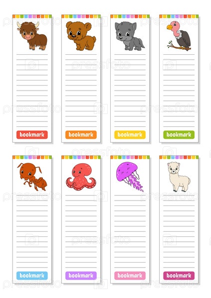 Набор бумажных закладок для книг с милыми героями мультфильмов. Для детей. Изолированные на белом фоне. Векторная иллюстрация