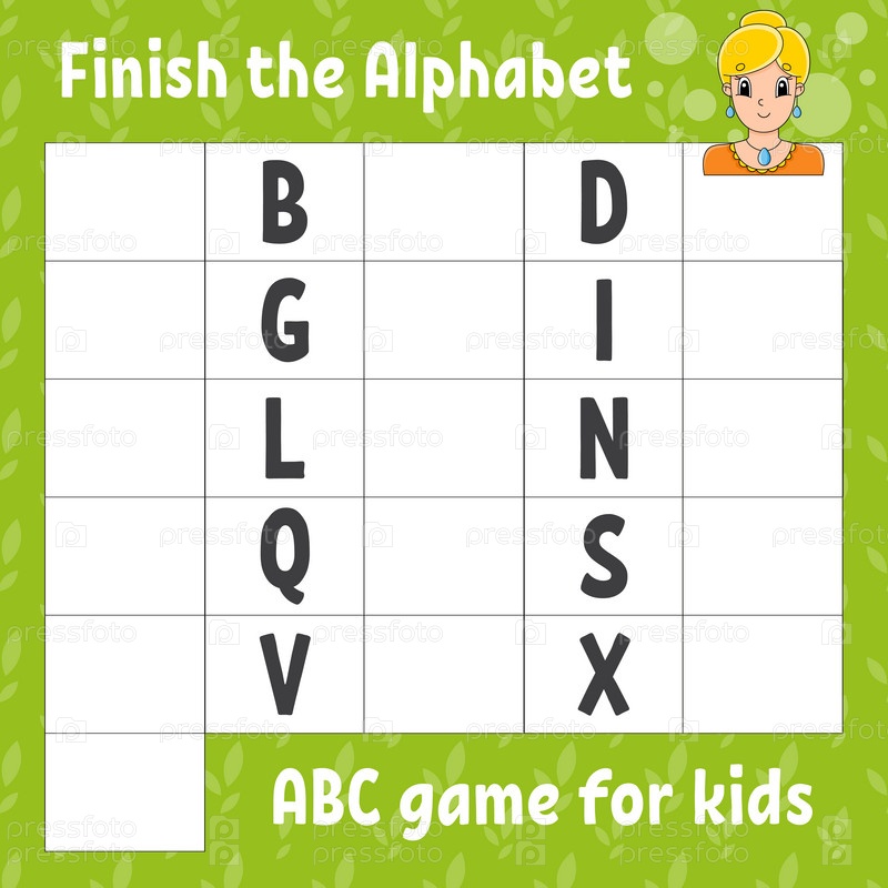 Закончите алфавит. Азбука для детей. Рабочий лист по развитию образования. Обучающая игра для детей. Цветная страница активности. Векторная иллюстрация