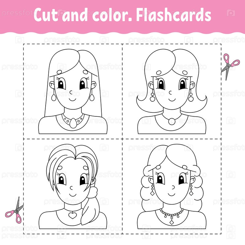 Вырезать и раскрасить. Набор карточек. Раскраска для детей. Милый мультяшный персонаж. Черный контурный силуэт. Изолированные на белом фоне. Векторная иллюстрация