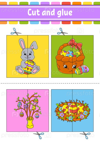 Вырежи и играй. Бумажная игра с клеем. Флэш-карты. Рабочий лист по образованию. Страница активности. Забавный персонаж. мультяшный стиль. Векторная иллюстрация