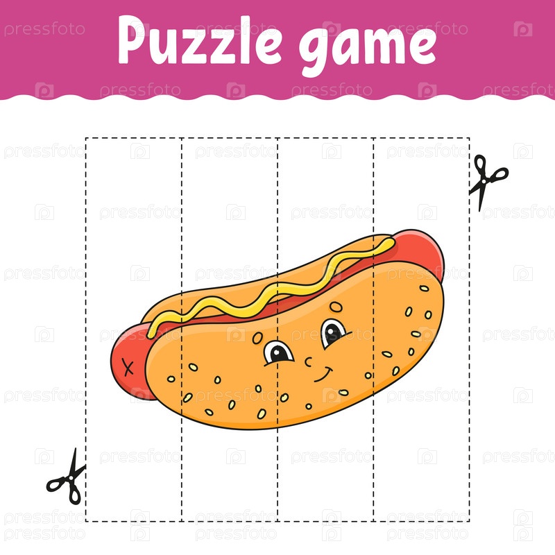 Игра-головоломка для детей. Практика резки. Рабочий лист по развитию образования. Страница активности. мультипликационный персонаж. Векторная иллюстрация