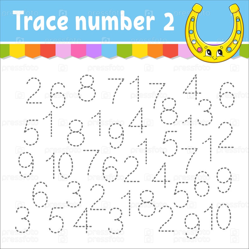 Номер трассировки. Практика почерка. Изучение цифр для детей. Рабочий лист по развитию образования. Страница активности. Игра для малышей и дошкольников. Векторная иллюстрация