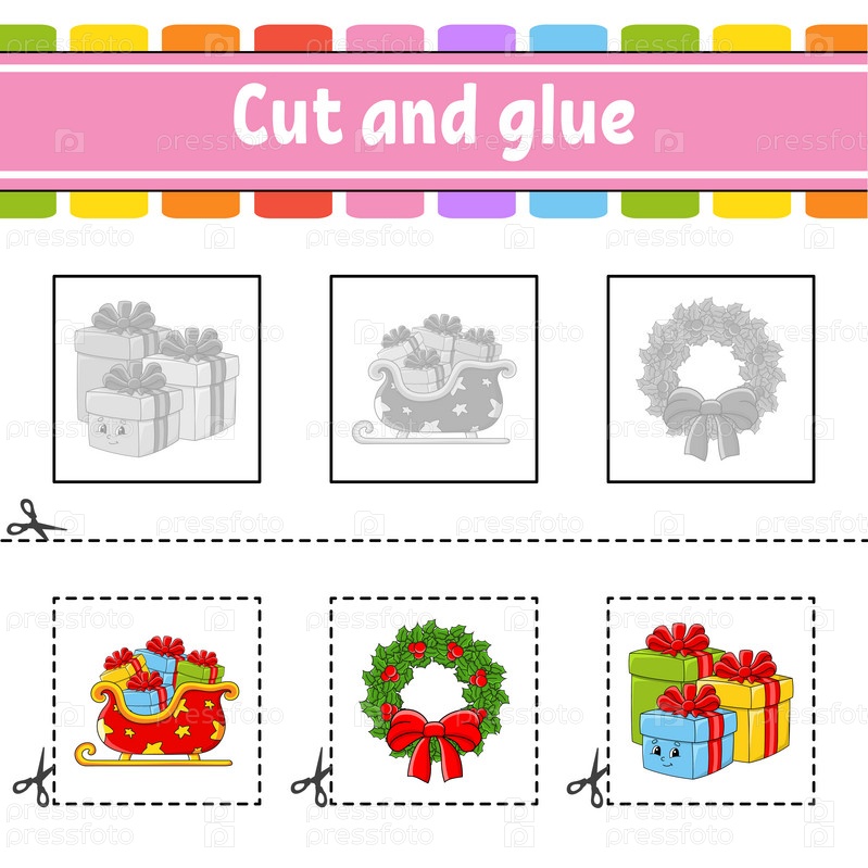 Вырезаем и приклеиваем. Игра для детей. Рабочий лист по развитию образования. Цветная страница активности. мультипликационный персонаж. Векторная иллюстрация