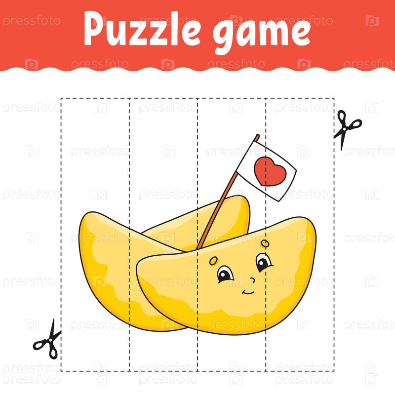 Игра-головоломка для детей. Практика резки. Рабочий лист по развитию образования. Страница активности. мультипликационный персонаж. Векторная иллюстрация
