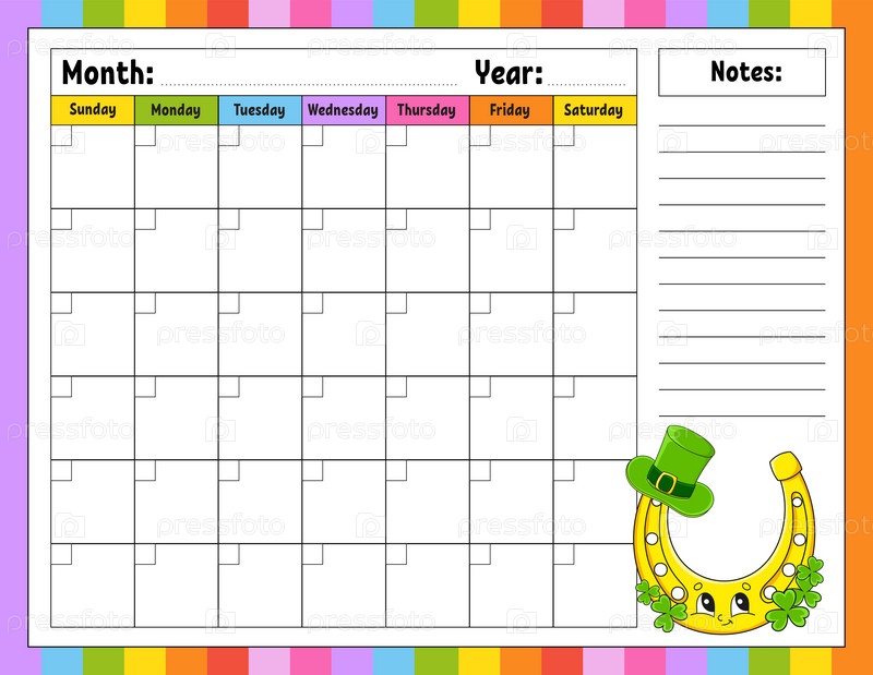 Пустой шаблон календаря на один месяц без дат. Красочный дизайн с милым персонажем. Векторная иллюстрация