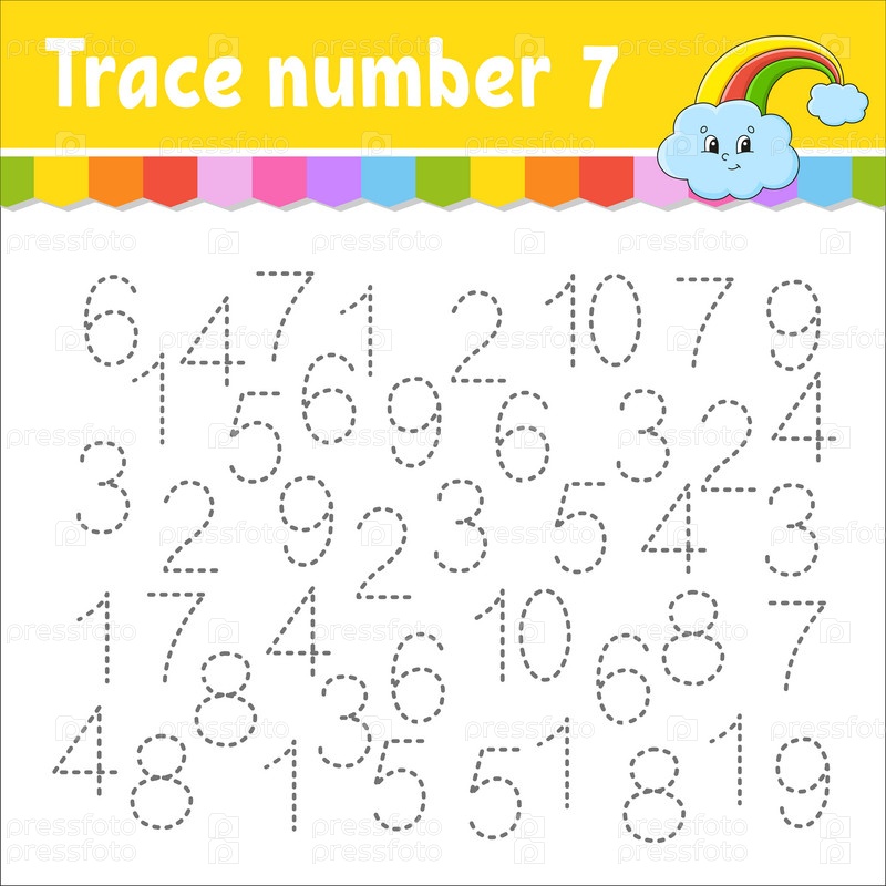 Номер трассировки. Практика почерка. Изучение цифр для детей. Рабочий лист по развитию образования. Страница активности. Игра для малышей и дошкольников. Векторная иллюстрация