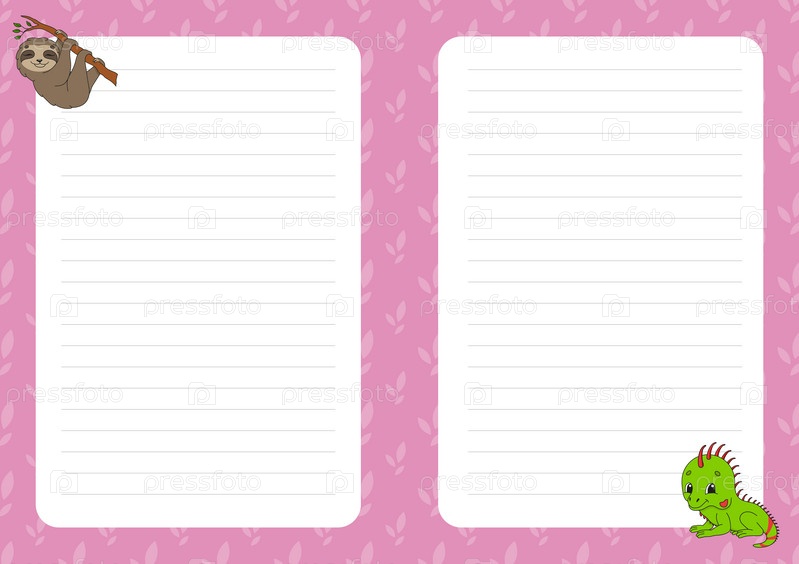 Цветной шаблон листа для заметок. Бумажная страница для журнала, блокнота, дневника, писем, расписания, органайзера. Милый мультяшный персонаж. Лист с подкладкой. Векторная иллюстрация