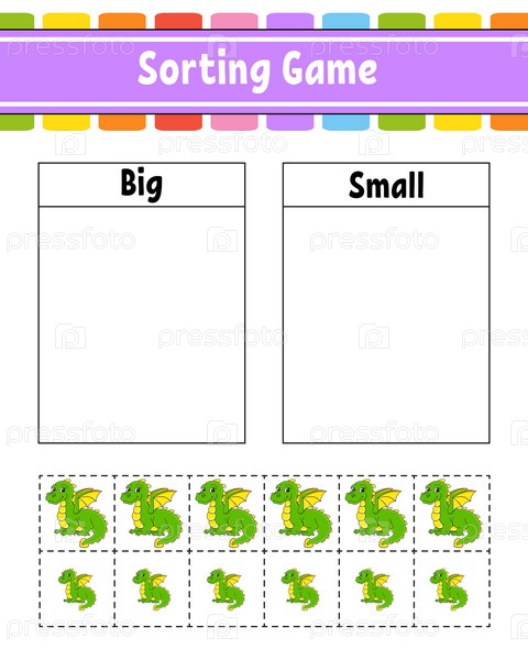 Сортировочная игра для детей. Счастливые персонажи. Большой и маленький. Рабочий лист по образованию. Векторная иллюстрация