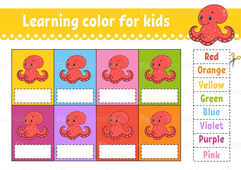 Изучение цвета для детей. Рабочий лист по развитию образования. Страница активности с цветными картинками. Загадка для детей. Забавный персонаж. мультяшный стиль. Векторная иллюстрация