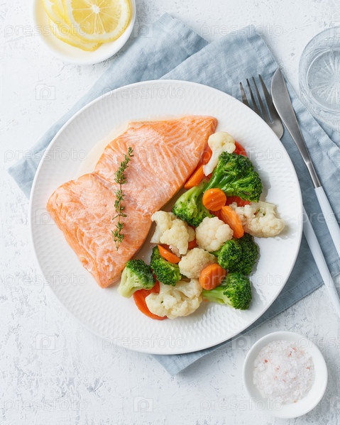 Паровой лосось и овощи, Палео, кето, фодмап, даш-диета. Средиземноморская диета с рыбой, приготовленной на пару. Здоровая концепция, белая тарелка на сером столе, без глютена, без лектина, вид сверху, вертикальный