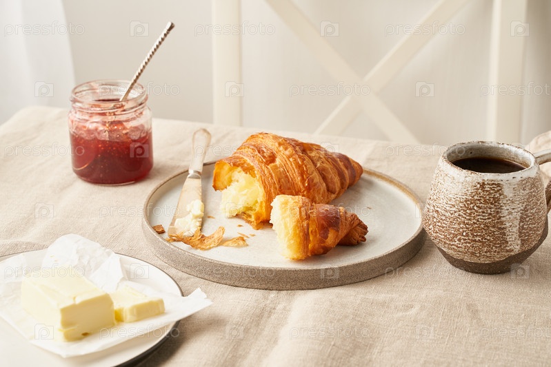 Вкусные круассаны на тарелке и горячий напиток в кружке, джеме и масле